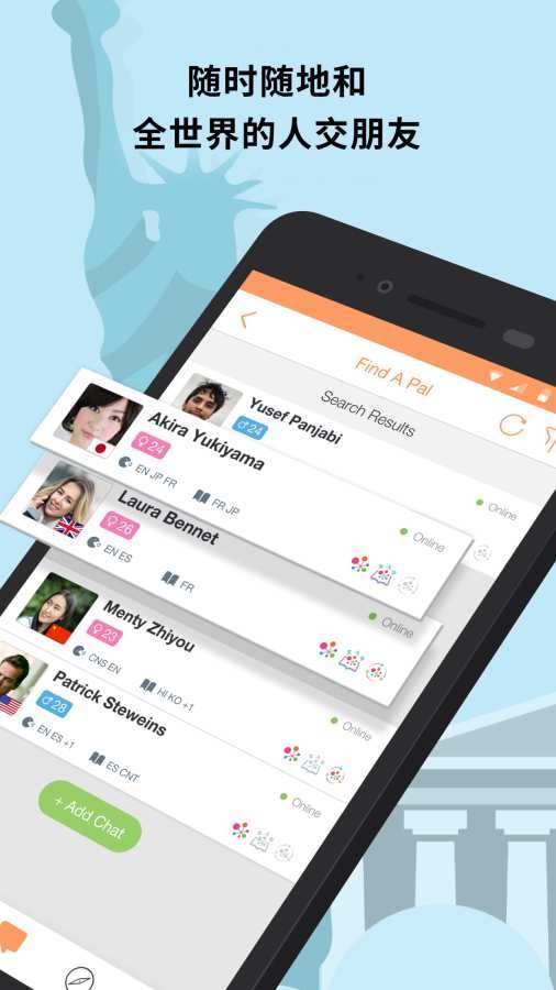 应用Hello Pal的配对作用,可按你的要求轻轻松松匹配语言小伙伴。依据汉语、在学语言、国家、地区等挑选出理想化语伴,立刻与她们无阻碍沟通交流!