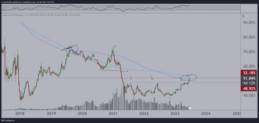 另一方面,加密货币分析师 Michael Van de Poppe 最近分享了一些有关比特币主导地位图表的见解。Van de Poppe 表示,“图表看起来想要继续上涨”,但有一些关键点需要记住。