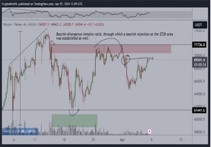 然而,随后的图表显示出持续存在的熊市分歧,这增加了BTC在72,000美元附近遭遇拒绝的可能性。与此同时,知名交易员和分析师Rekt Capital也对此表示认同,他认为本周的走势有望顺利完成。